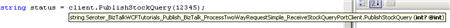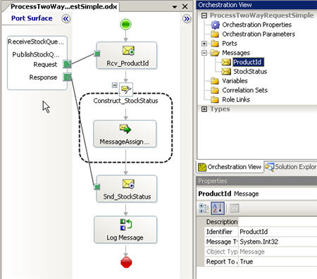 The orchestration has an input message, “ProductId” of .NET type System.Int32. The orchestration returns a message named “StockStatus” which is of type System.String.