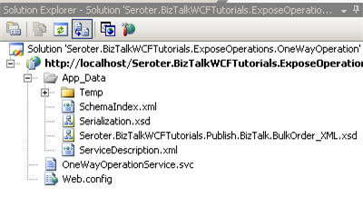 At this point, this is the only BizTalk project artifact needed. Unlike using the basic SOAP BizTalk Web Services Publishing Wizard, one does NOT have to deploy their BizTalk solution prior to using the BizTalk WCF Service Publishing Wizard. The BizTalk Web Services Publishing Wizard always uses the version of the project assembly in the GAC, meaning a project had to be deployed (and GAC-ed) to see all the relevant artifacts. The BizTalk WCF Publishing Wizard only requires a project to be built (i.e. a dll compiled).