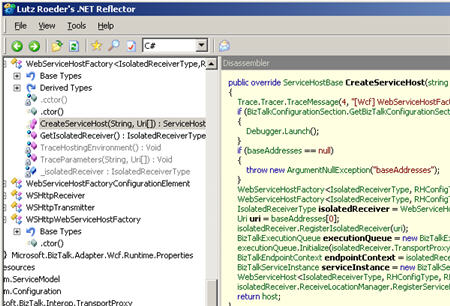 The “OneWayOperationService.svc” has only the simple ServiceHost declaration at the top. The ServiceHost element has the “Factory” attribute which points to the Microsoft.BizTalk.Adapter.Wcf.Runtime.WSHttpWebServiceHostFactory object. Using Reflector, one can see that BizTalk overrides the WCF ServiceHostFactory object in order to dynamically return a generic service host based on the receive location.