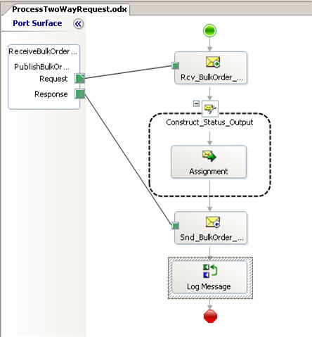 This demonstration uses a simple orchestration and a request-response input port. The outbound message is of the same type as the inbound, and the “status” value is changed to “received” before returning the response.