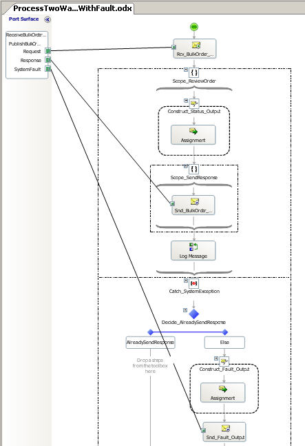 So, WCF faults are returned much like SOAP faults from orchestrations. The below orchestration receives a message, sends a response, but if an exception is raised within the orchestration, a fault message is returned instead. The orchestration does a “divide by 0” in the response message construct block, thus causing an exception to occur at runtime.