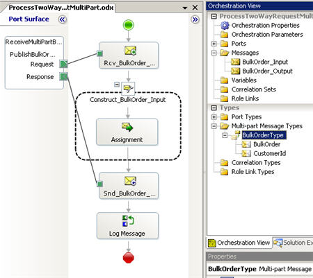 How about the situation where the BizTalk designer wants multiple parameters to appear in their exposed service? This demonstration uses an orchestration which accepts, and returns, a multi-part message type using an IIS-hosted WCF endpoint.