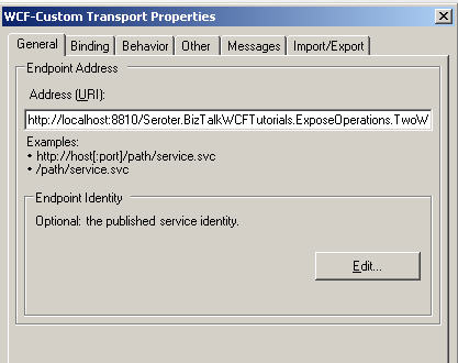 Now that one-way services have been looked at, let’s explore how two-way services are generated from BizTalk. Instead of hosting this WCF service in IIS, this example shows how to host the HTTP-based WCF service endpoint directly within BizTalk itself.