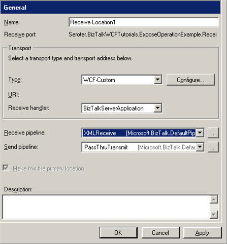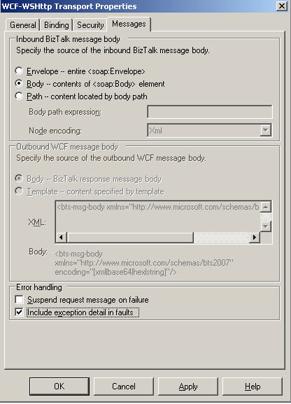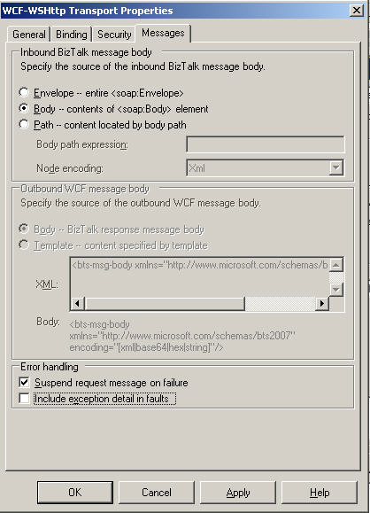 Notice in the picture above that the “Suspend request message on failure” checkbox is selected. In this case, if an exception occurs on receipt, the caller receives an HTTP “ok” message, while BizTalk suspends the message with the full error.