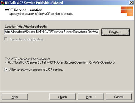 Notice that a “Browse” button is finally available in BizTalk Server 2006 R2 for choosing the host. After a confirmation step, the wizard generates the WCF service and deploys it to the chosen IIS web site container.