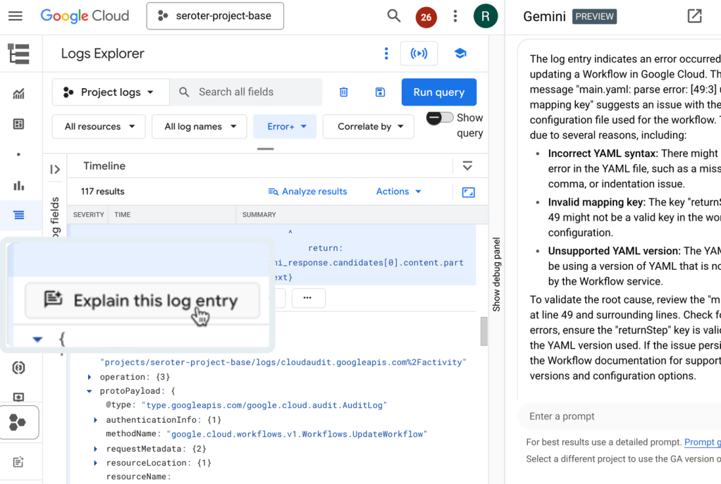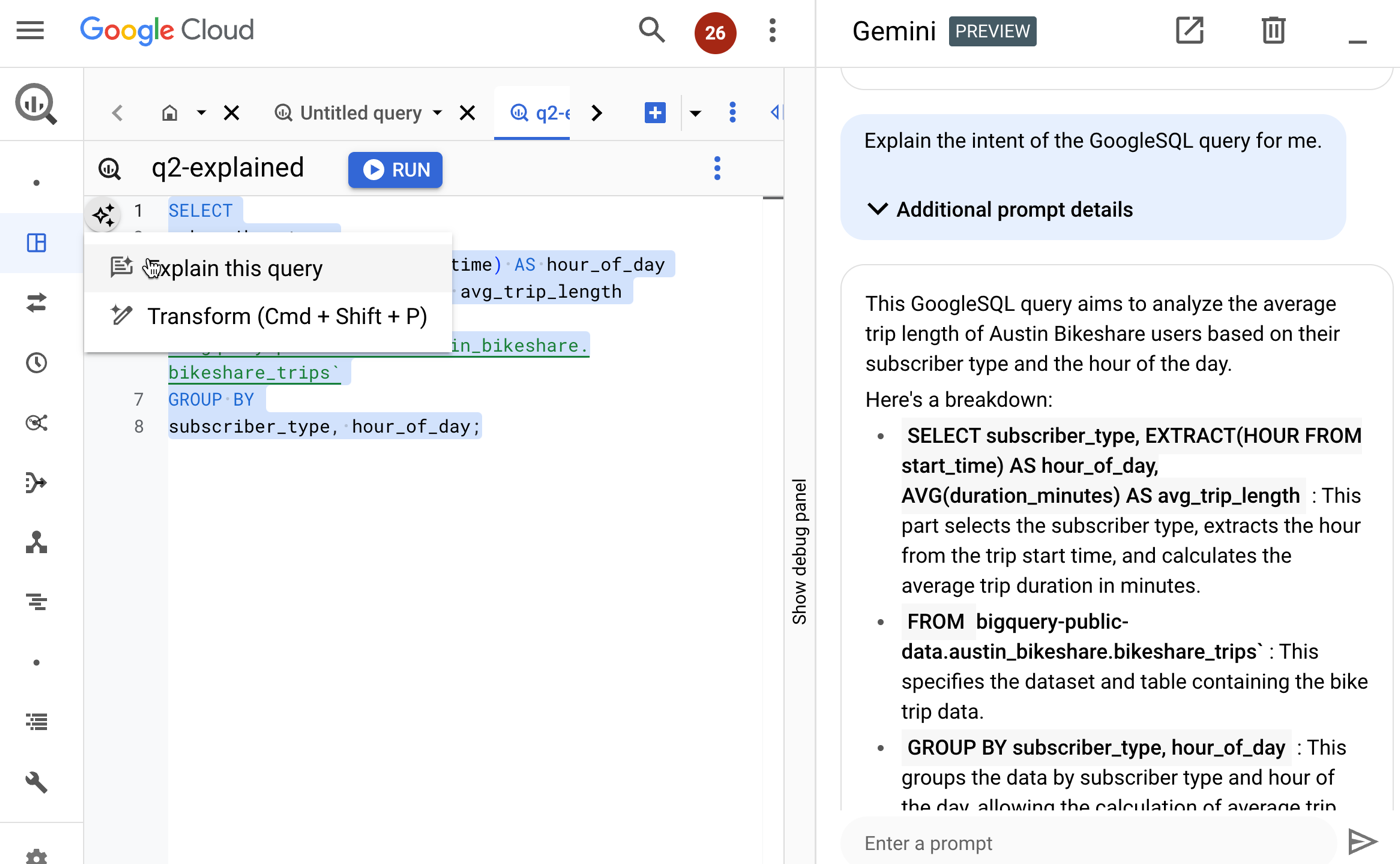 Gemini for Google Cloud blends AI-assistance into many different services. One way to use this is to understand existing SQL scripts, workflows, APIs, and more.
