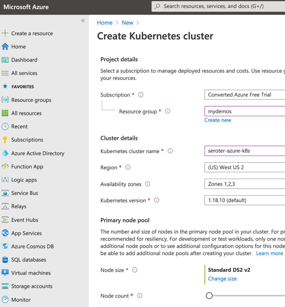 Next, I created a new AKS cluster via the Azure Portal.