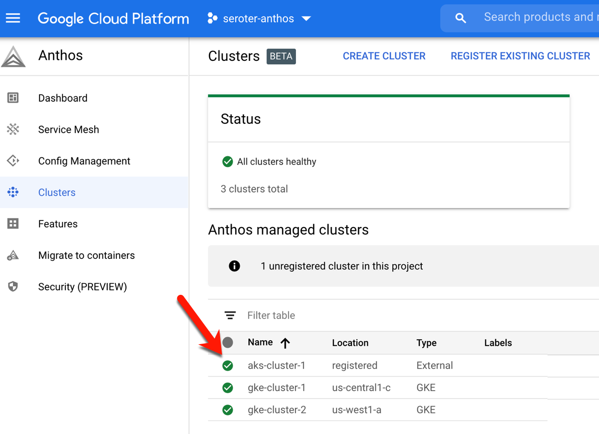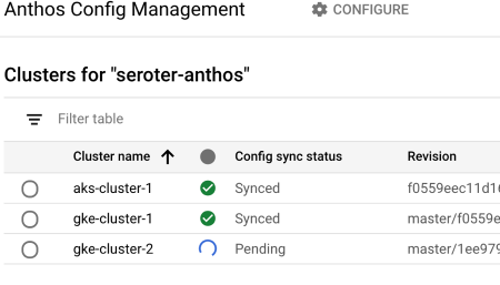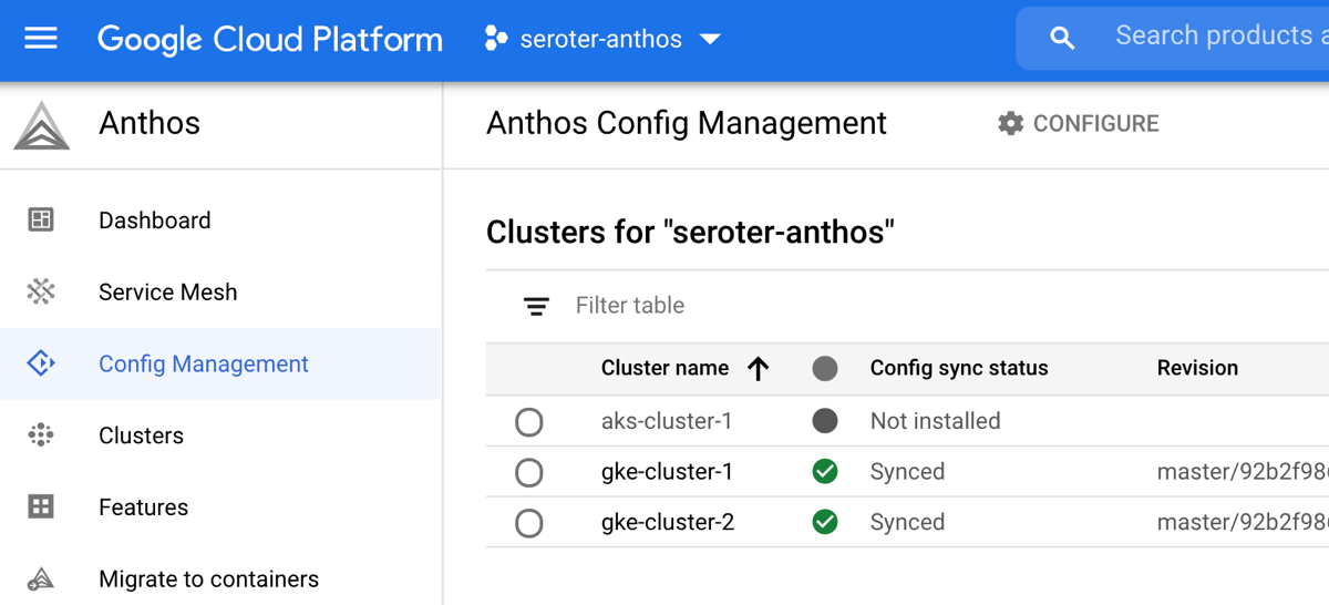 I started by creating two GKE clusters in GCP. I can do this via the Console, CLI, Terraform, and more. Once I created these clusters (in different regions, but same GCP project), I registered both to the Anthos control plane. In GCP, the “project” (here, seroter-anthos) is also the environ.