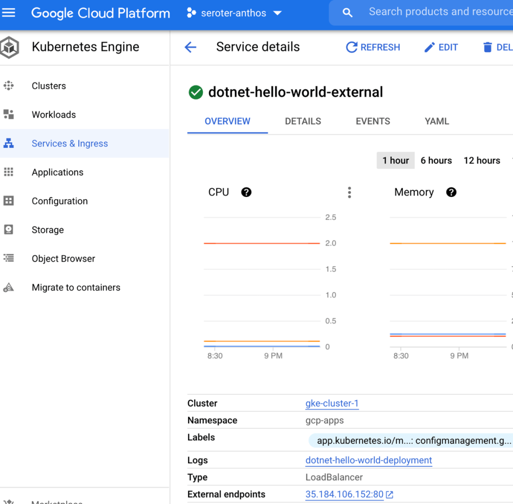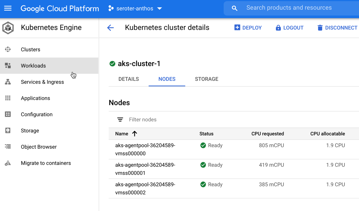 You know what’s pretty awesome? Once this AKS cluster is connected, I can view all sorts of information about cluster nodes, workloads, services, and configurations. And, I can even deploy workloads to AKS via the GCP Console. Wild.