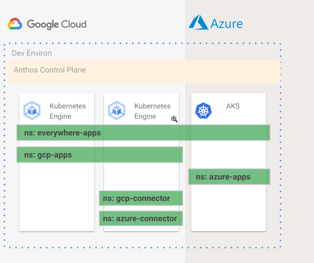 Now we’re ready. What are we building? I’m going to provision two Anthos clusters in GCP, then attach an Azure AKS cluster to that Anthos environ, apply a consistent configuration to these clusters, install the GCP Config Connector and Azure Service Operators into one cluster, and use Config Sync to deploy cloud managed services and apps to both clouds. Why? Once I have this in place, I have a single way to create managed services or deploy apps to multiple clouds, and keep all these clusters identically configured. Developers have less to learn, operators have less to do. GitOps and KRM, FTW!