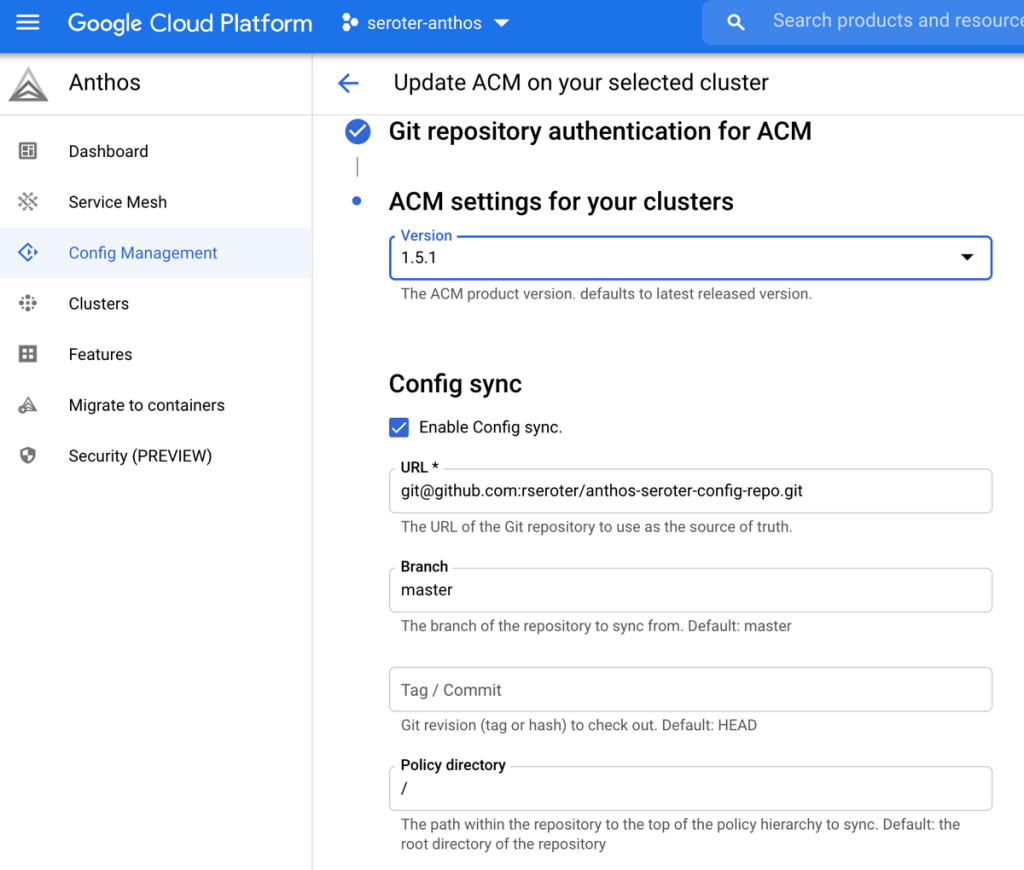 With that done, I went through the GCP Console (or you can do this via CLI) to add ACM to each cluster. I chose to use SSH as the authentication mechanism, and then pointed to my GitHub repo.