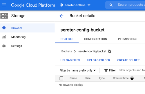 Ok, it’s the moment of truth. First, I checked Cloud Storage and saw my brand new bucket, provisioned by Anthos.