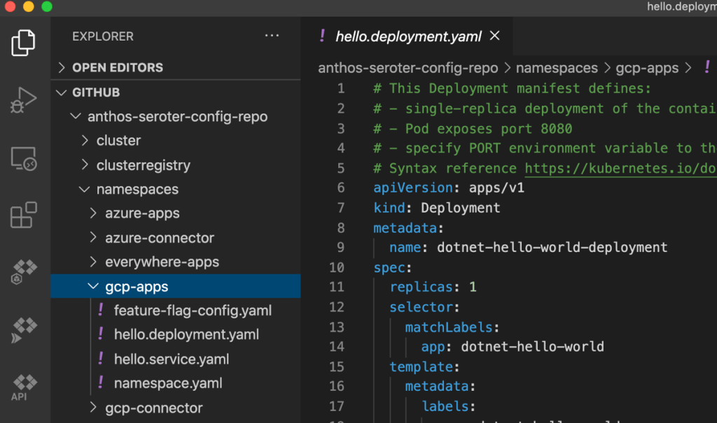 Finally, we can also deploy applications this way. Imagine using a CI pipeline to populate a Kubernetes deployment template (using kpt, or something else) and dropping it into a git repo. Then, we use the Kubernetes resource model to deploy the application container. In the gcp-apps directory, I added Kubernetes deployment and service YAML files that reference a basic app I containerized.
