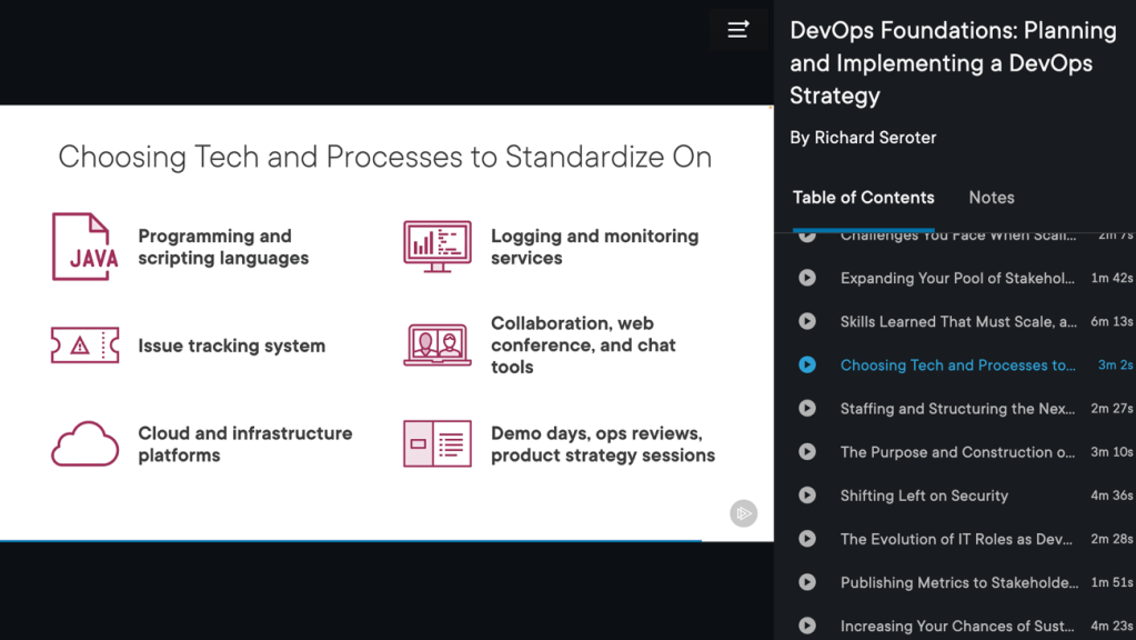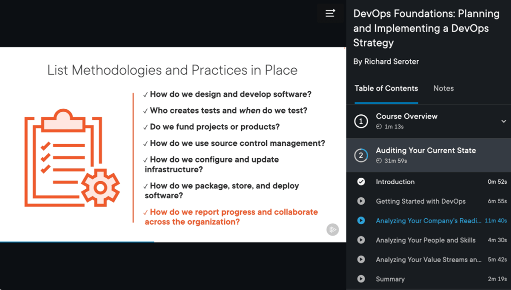 The course has three modules and runs about 90 minutes total. The first module helps you audit your current state so that you start your journey on the right foot. Here, we talk about questions to ask about your company’s readiness, existing skills, and value streams.