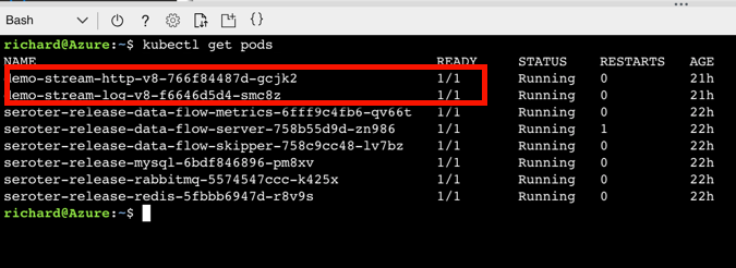 After deploying my streaming pipeline, I saw new pods shows up in AKS: one pod for each component of my pipeline.