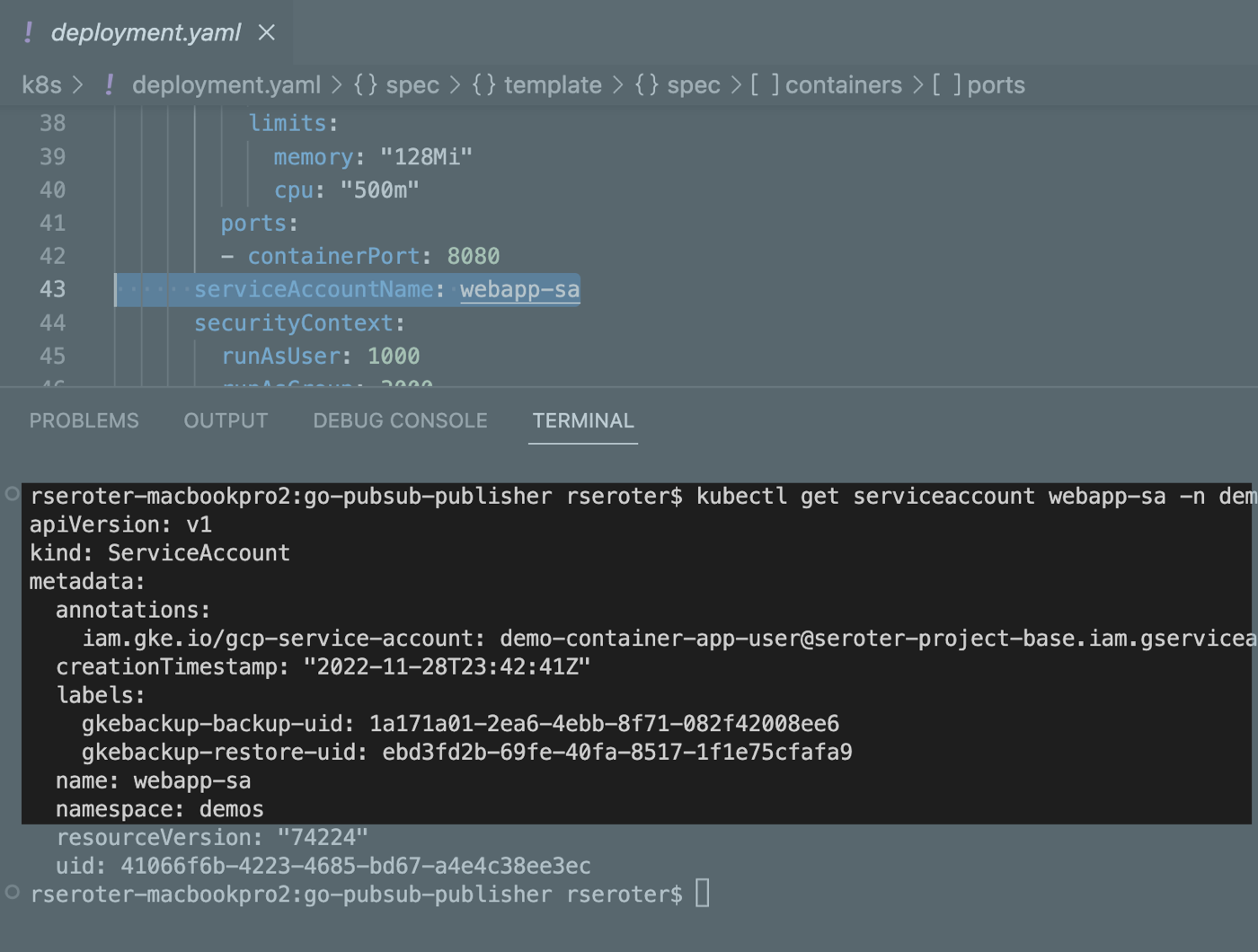 Time to deploy! I’m using Cloud Build to generate a container image without using a Dockerfile. A single command triggers the upload, build, and packaging of my app.