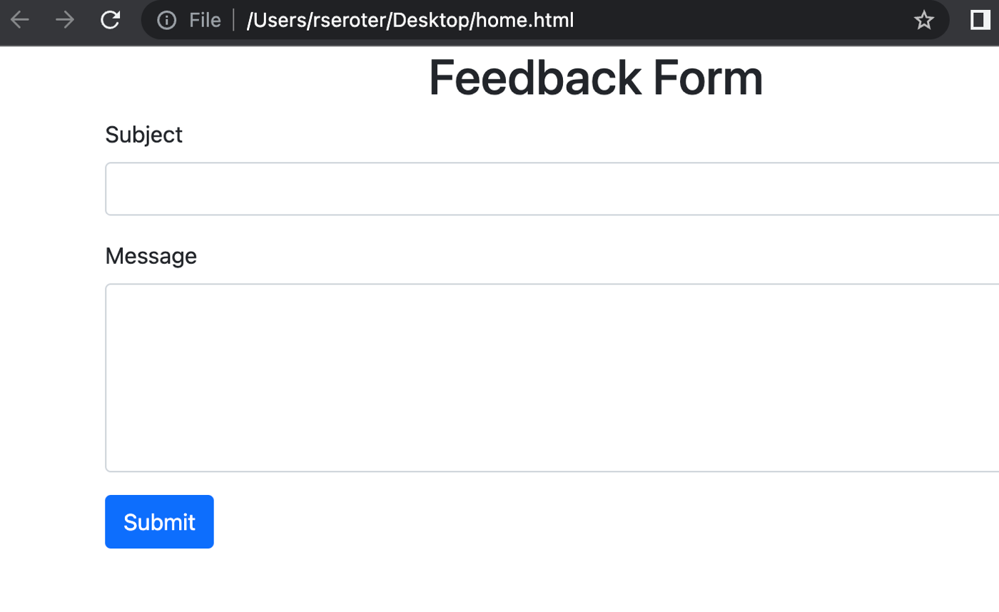 Write an HTML page that uses the latest version of Bootstrap to center a heading that says “Feedback Form.” Then include a form with inputs for “subject” and “message” to go with a submit button.