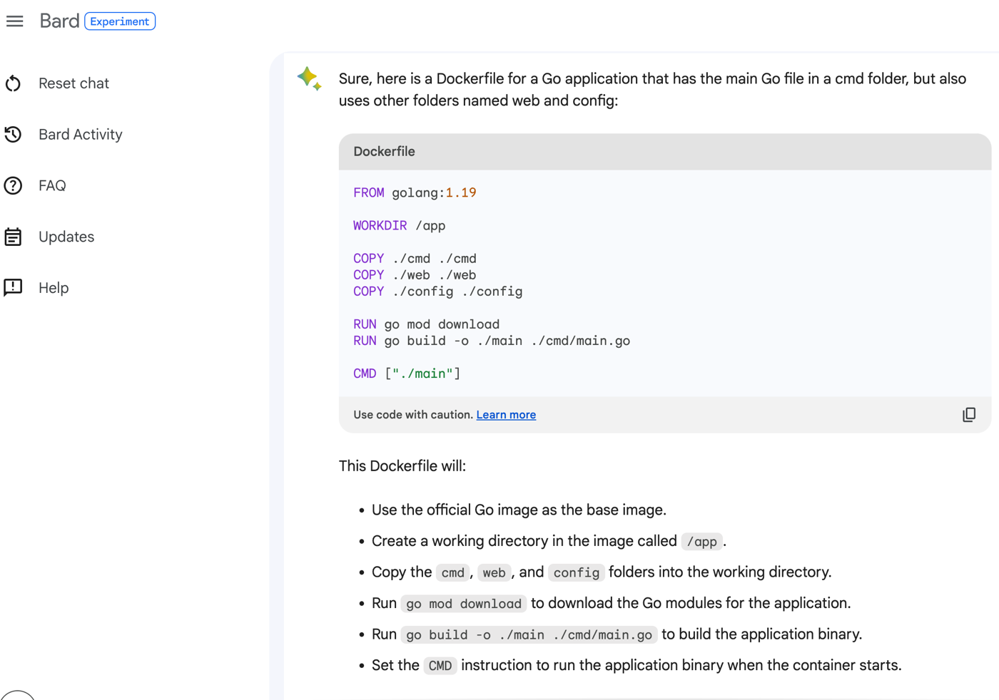Dockerfiles still intimidate me for some reason. I like the idea of describing what I need, and having Bard give me a starter Dockerfile to work with. Full disclosure, I tried getting Bard to generate a valid Dockerfile for a few of my sample GitHub repos, and I couldn’t get a good one.