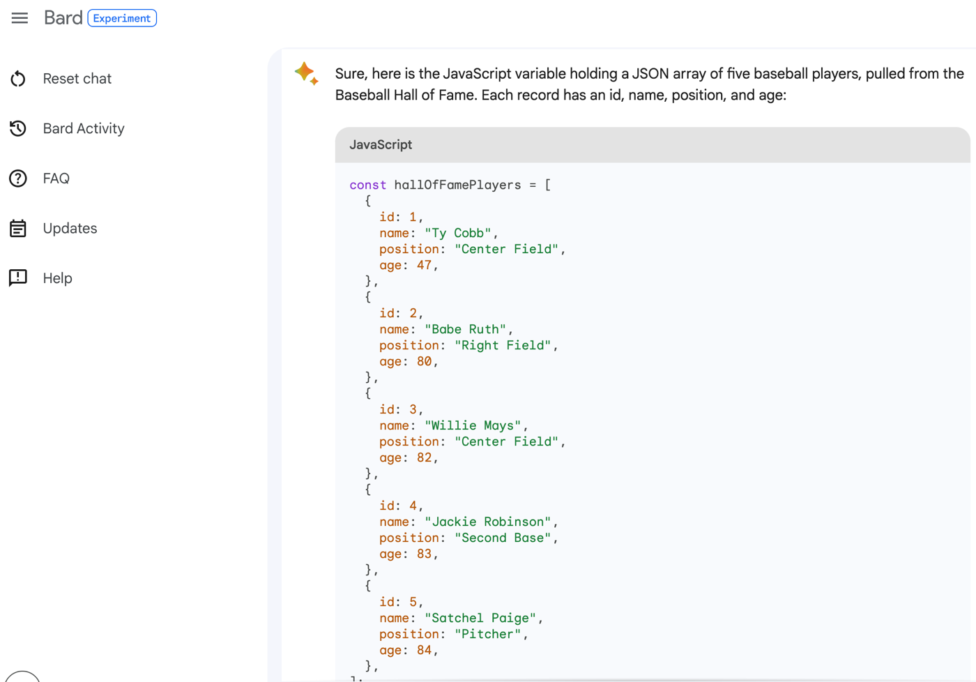 I can then ask Bard to convert that to XML, CSV, or any number of formats. I might want more records or fewer records. This also works if you ask for your favorite television characters, musicians from the 1990s, or types of potatoes. Generate data without taxing your brain.