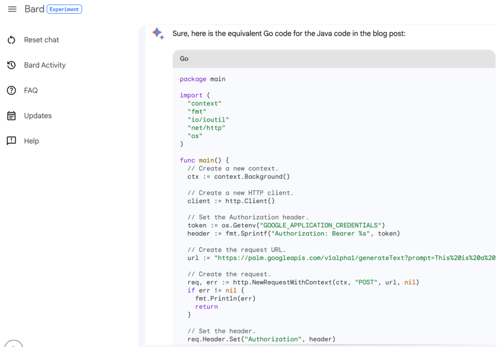 Consider the case where you find code for calling a particular HTTP endpoint, but it’s in Java and your app is written in Go. My colleague Guillaume just wrote up a great post about calling our new Google PaLM LLM API via a Java app. I can ask for all the code in the post to be converted to Go.