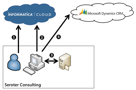 In this solution, (1) I leverage the web-based designer to craft the ETL between Salesforce.com and Dynamics CRM Online, (2) use a locally installed Secure Cloud Agent to retrieve ETL details, (3) pull data from Salesforce.com, and finally (4) move that data into Dynamics CRM Online.