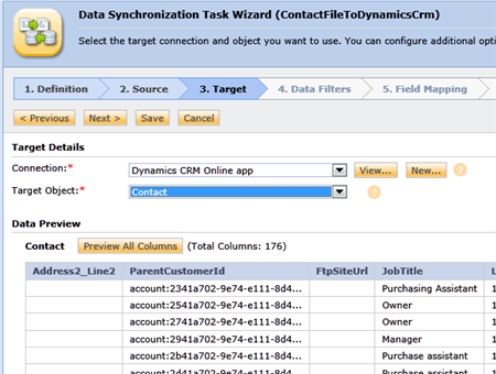 On the next wizard page, I configured a connection to my ETL target. I chose an existing Dynamics CRM Online connection, and selected the “Contact” entity.