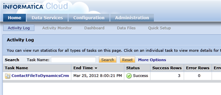 After a few moments, the task runs and I could see in the Informatica Cloud’s Activity Log that this task completed successfully.