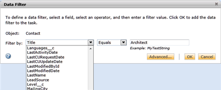 Instead of transferring all the data from my Salesforce.com organization to my Dynamics CRM Online organization, I  used the next wizard page to define a data filter. In my case, I’m only going to grab Salesforce.com contacts that have a title of “Architect”.