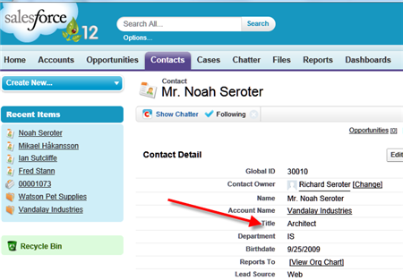 I have this record in my Salesforce.com application. Notice the “title” of Architect.